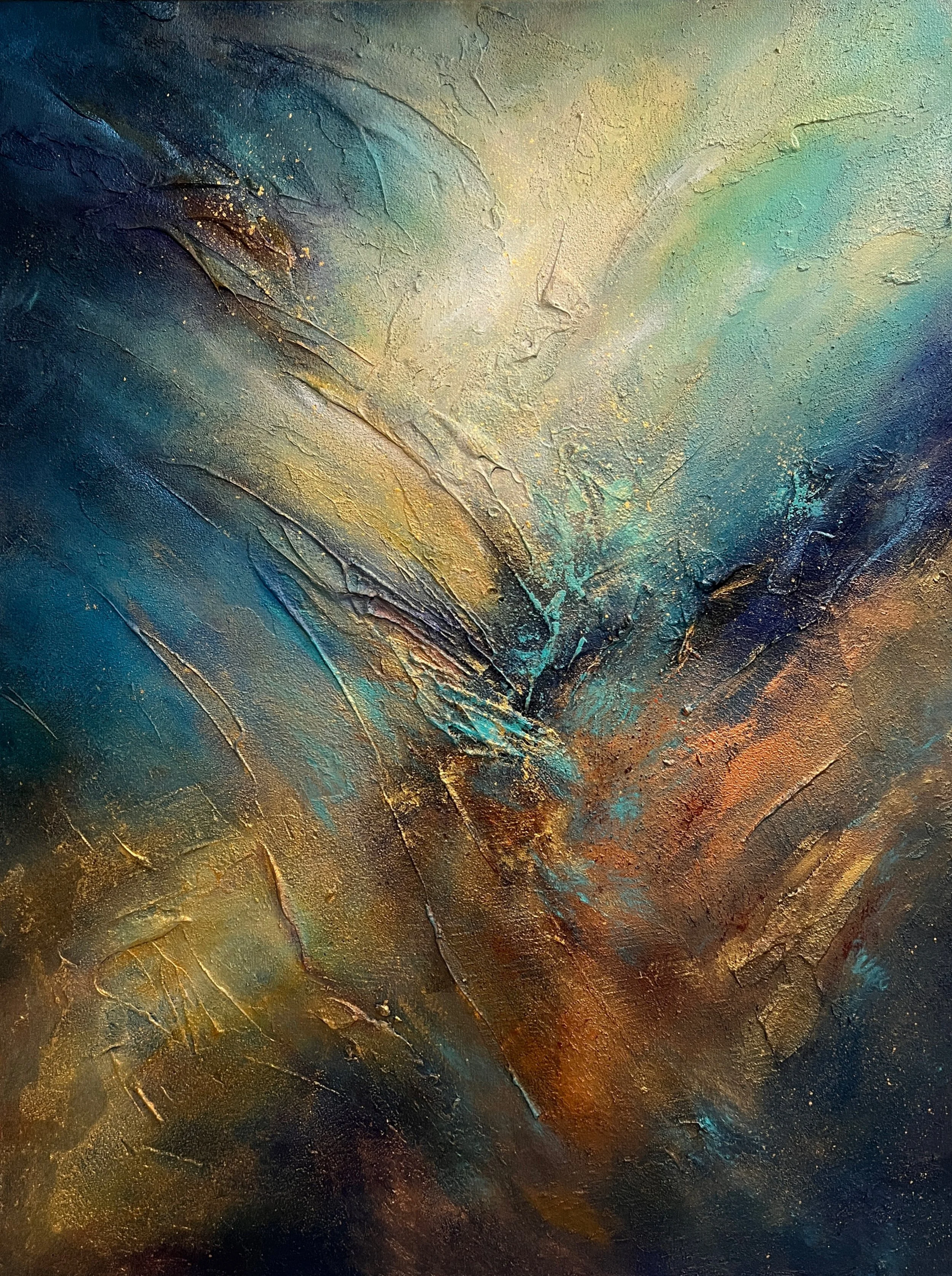 “Collision, Diptych” by Ivy Lim captures a powerful burst of energy—where fiery reds and golds crash into deep blues and greens, evoking movement, tension, and transformation. A visual metaphor for impact and change, the piece explores the beauty that emerges from chaos.