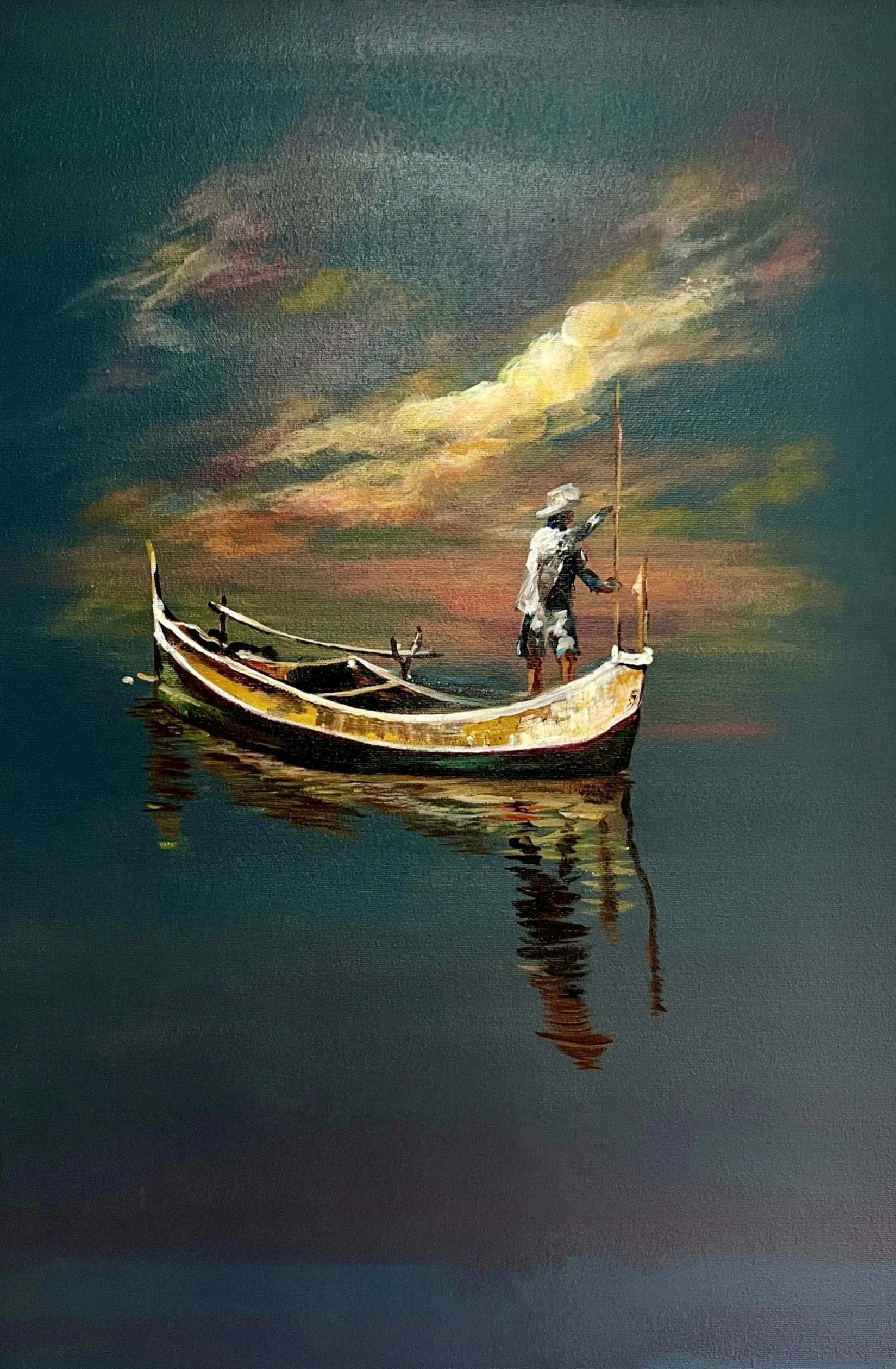 A contemplative piece that speaks to solitude and inner rhythm, “Still Waters, Moving Soul” captures a lone fisherman poised on a traditional boat, adrift in a mirror-like sea. The golden light of dusk stretches across the sky and reflects in the water, blurring the line between earth and spirit. With every detail—from the ripples to the gentle lean of the figure—Ivy Lim invites viewers into a moment of stillness that resonates with quiet power and deep emotion. It's a portrait not just of a man at sea, but of a soul in motion.